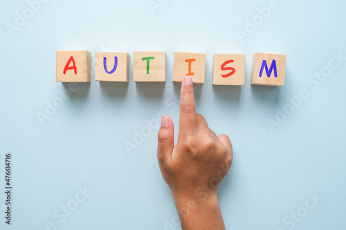 © Reza, Fototapeta premium Children hand and autism on wooden squares blue background top view