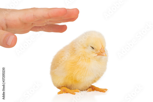 © Gribanov, Fototapeta premium children hand stroking a chicken