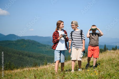 Fototapeta premium Children hiking in mountains using camera and binoculars