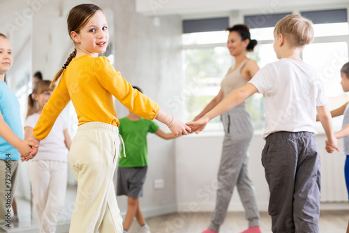 Obraz premium Children holding hands and dancing in a round dance in choreography class
