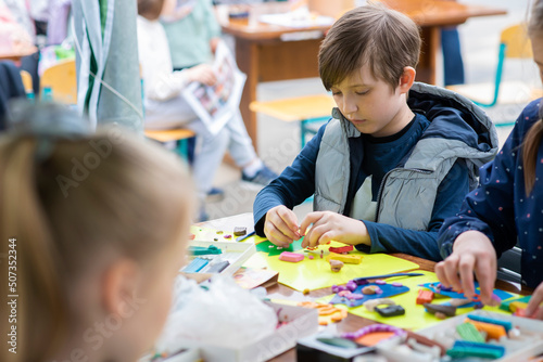 © Ruslan Russland, Fototapeta premium children in the master class make crafts from colored paper and plasticine