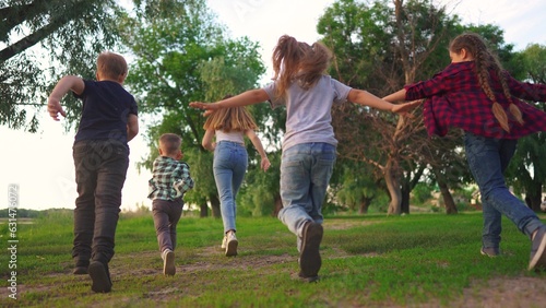 Fototapeta premium children in the park. boys and girls run through the green park laughing. spending time with friends. happy family kids dream concept lifestyle