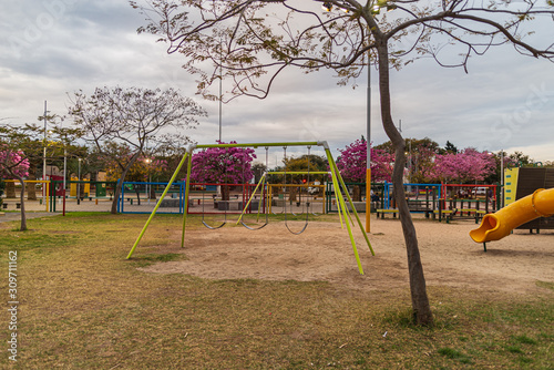 Fototapeta premium Children kid playground for leisure and recreation activity with toy and slider leftover in the park in childhood color style.