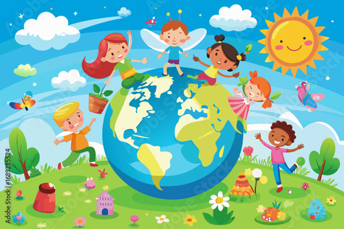 © Najmul Design Hub, Naklejka premium Children of the world celebrating together on a happy planet