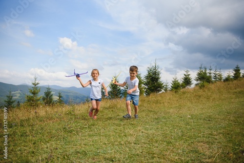 Obraz premium Children pilot aviator with airplane dreams of traveling in summer in nature....