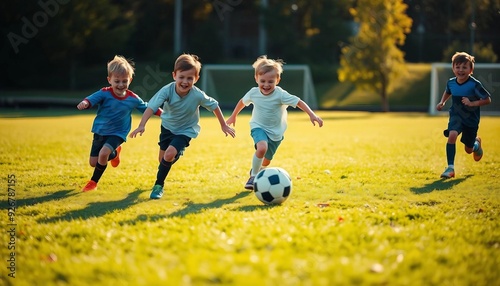 Obraz premium Children play soccer energetically on a grass field, with a focus on the...