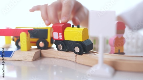 Fototapeta premium Children play with a toy train in kindergarten. Child childhood fun concept. Train with toy is traveling along railway. Children play with toys and trains on the railway in kindergarten lifestyle.