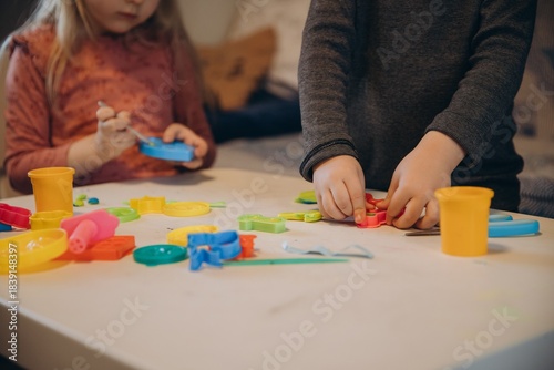 © dsheremeta, Fototapeta premium Children playing creative games with colorful play dough