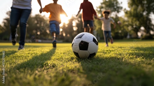 Fototapeta premium Children playing soccer in park during sunset outdoor sports activity grass field joyful environment dynamic viewpoint for family fun