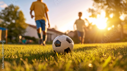 Fototapeta premium Children playing soccer in sunny backyard, with soccer ball in focus on grass. warm sunlight creates joyful atmosphere, capturing essence of outdoor play