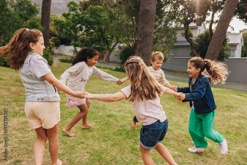 Fototapeta premium Children playing together in a grassy park during a sunny day