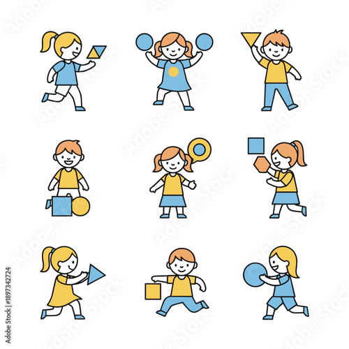© NezukoArt, Naklejka premium Children playing with various shapes and objects in an energetic and lively scene from a straightforward viewpoint.