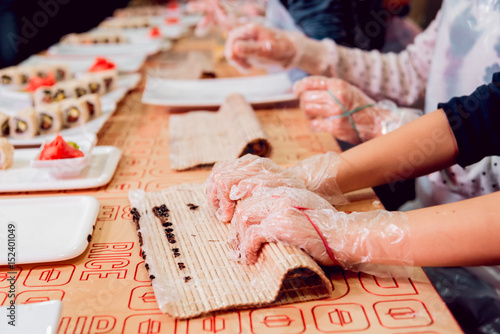 © romaset, Obraz premium Children prepare sushi and rolls