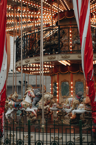 © asauriet, Fototapeta premium Children ride horses and teddy bear on children's carousels in an amusement park.