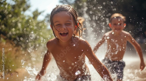 Obraz premium Children running through sprinklers, their faces lit up with joy on a sunny day.