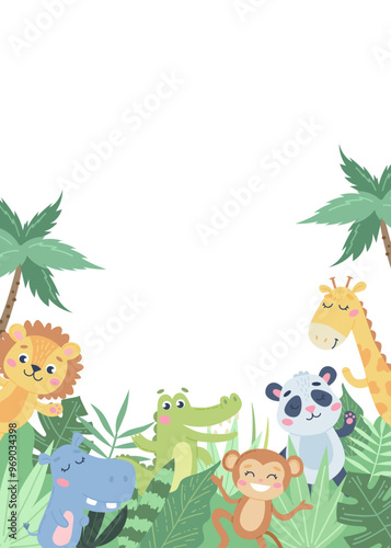 Fototapeta premium Children s animals background. Cute animals in the jungle on white. Vector...
