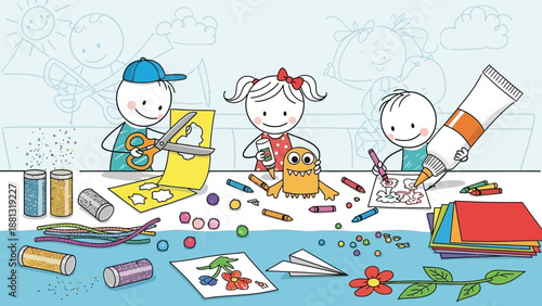 © Wong, Fototapeta premium Children's Art Class: Kids Crafting, Drawing, and Creating with Supplies