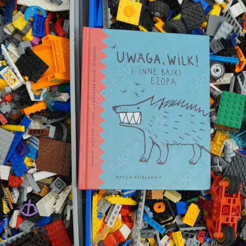© Everyday Frame, Fototapeta premium Children's book "Uwaga, Wilk!" on a background of colorful building blocks