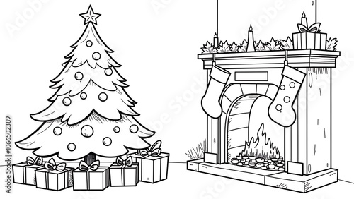 Fototapeta premium Children's coloring Christmas tree, gifts, fireplace, Christmas stocking