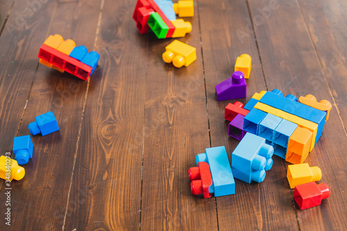 © LennaMarch, Obraz premium Children's developmental constructor. A child builds a tower of colored cubes.