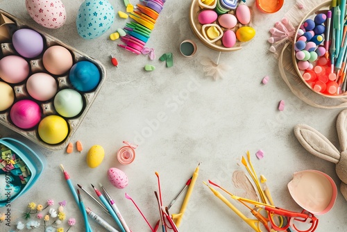 © Kristian, Fototapeta premium Children's Easter Craft Area Flat Lay with Egg Painting Kits