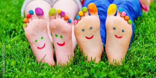 Fototapeta premium Children's feet with a pattern of paints smile on the green grass. Selective...
