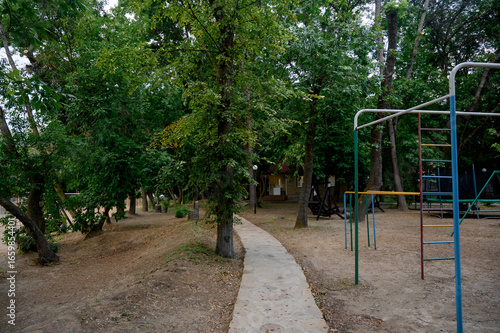 © bo.kvk, Fototapeta premium Children's playground with a view of the house and slide in the park