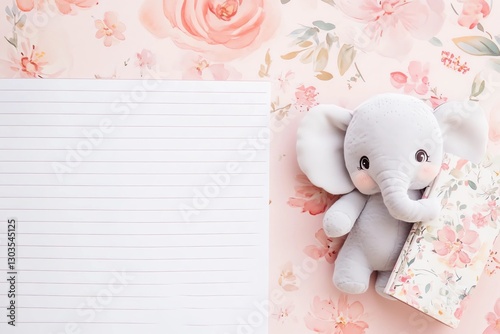 © Marina, Obraz premium Children's ruled stationery pages in muted pink color with a cute little elephant