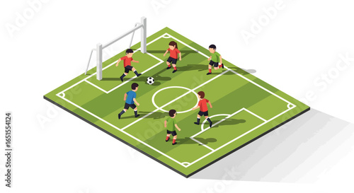 Fototapeta premium Children's soccer team in a competitive game on an isometric field. Vector graphic representing youth sports, activity, and teamwork.