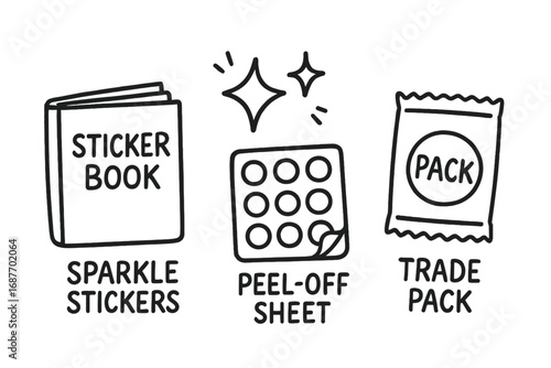 © Sergey, Naklejka premium Children's Sticker Collection. Children’s sticker collection hobby doodle set: hand drawn icons for sticker book, sparkle stickers