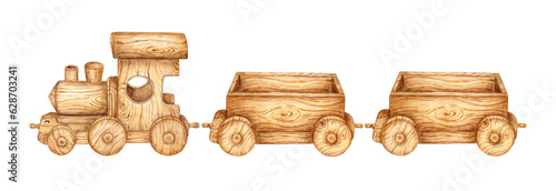 © AliCris, Naklejka premium Children's toy wooden train and two carts. Watercolor illustration of transport for small children on an isolated background. Drawing of a toy train for children's design.