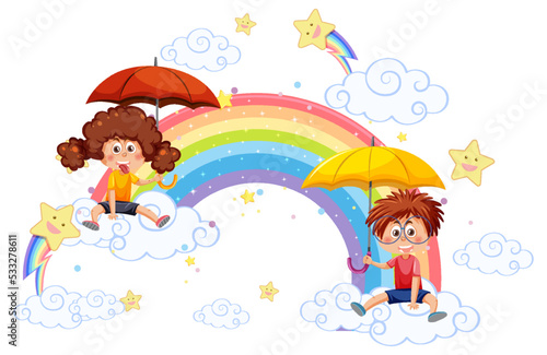 Obraz premium Children sitting on clouds with rainbow