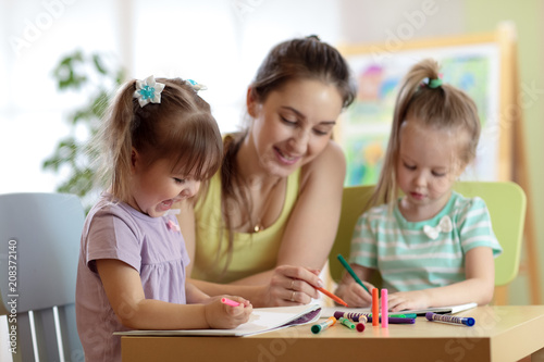 © Oksana Kuzmina, Fototapeta premium Children students with teacher drawing in art school class. Mom and kids at home. Children indulge.