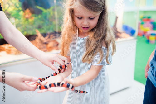 Naklejka premium children touch the snake at the zoo
