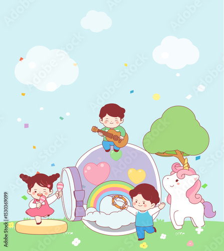 © jinseo lee, Obraz premium Children, unicorns, fields, nature, fun