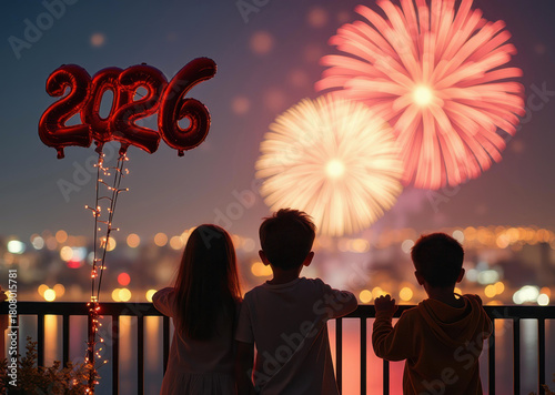 © Gianpiero, Obraz premium Children watching 2026 New Year's Eve fireworks from a balcony, with red number balloons against a vibrant city skyline and night sky.