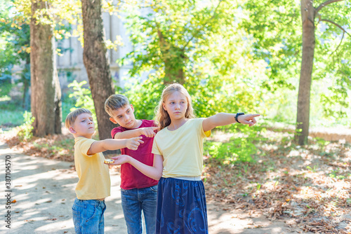 Fototapeta premium Children with a compass point their fingers where to go. Children's rest and entertainment in the park.