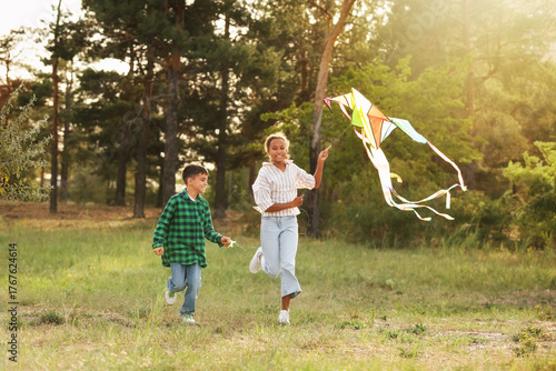 © Pixel-Shot, Fototapeta premium Children with kite running in park