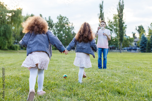 Fototapeta premium Children with parents in the park. Cute family haming fun in nature. Twin...