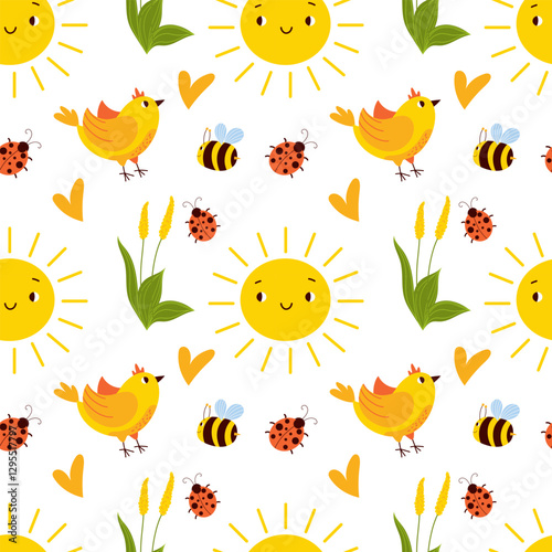 Fototapeta premium Childrens cute pattern, vector flat illustrations, sun, flowers, bee, ladybug, bird seamless pattern, background