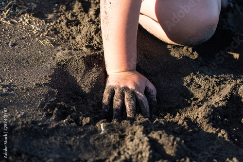 © ecummings00, Fototapeta premium Childs hands playing on beach building sand structures