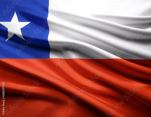 © Saddha Visual, Naklejka premium Chile flag waving in the wind on side position provides copy space for text isolated