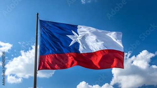 Naklejka premium Chilean National Flag Proudly Flies Against Clear Blue Sky Signifying Heritage and Unity : Generative AI