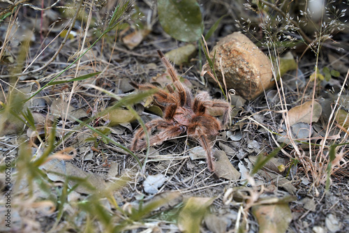 Fototapeta premium Chilean Tarantula in defense position among vegetation