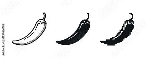Obraz premium Chili pepper evolution: hand-drawn, solid, pixel styles on white background
