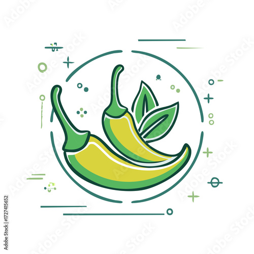 Fototapeta premium Chili peppers and leaves in circle icon with decorative elements
