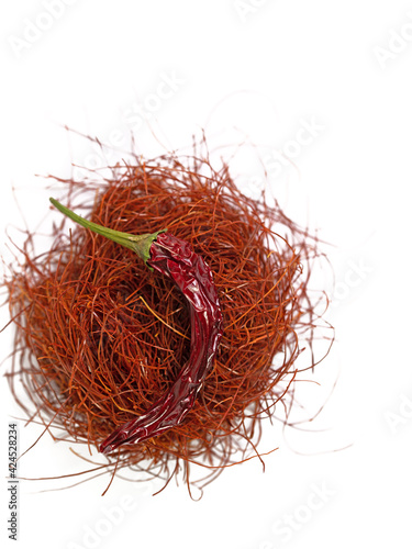 Fototapeta premium Chilifäden und Chilischote isoliert vor weißem Hintergrund
