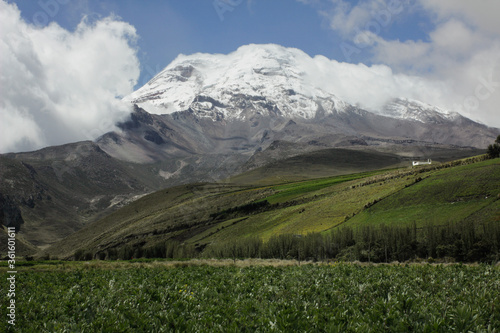 Fototapeta premium Chimborazo Volcano surrounded by green fields. The Highest mountain in Ecuador
