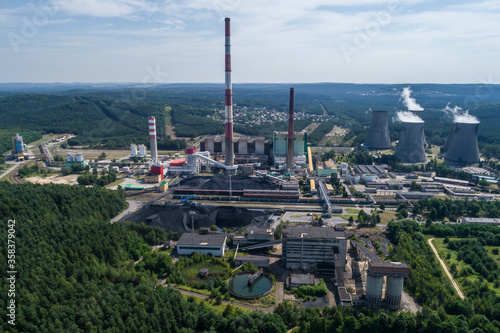 © Chawran, Obraz premium Chimneys and big heating plant powerhouse Siersza Trzebinia Poland aerial drone