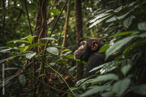 Obraz premium Chimpanzee in Dense Jungle Foliage